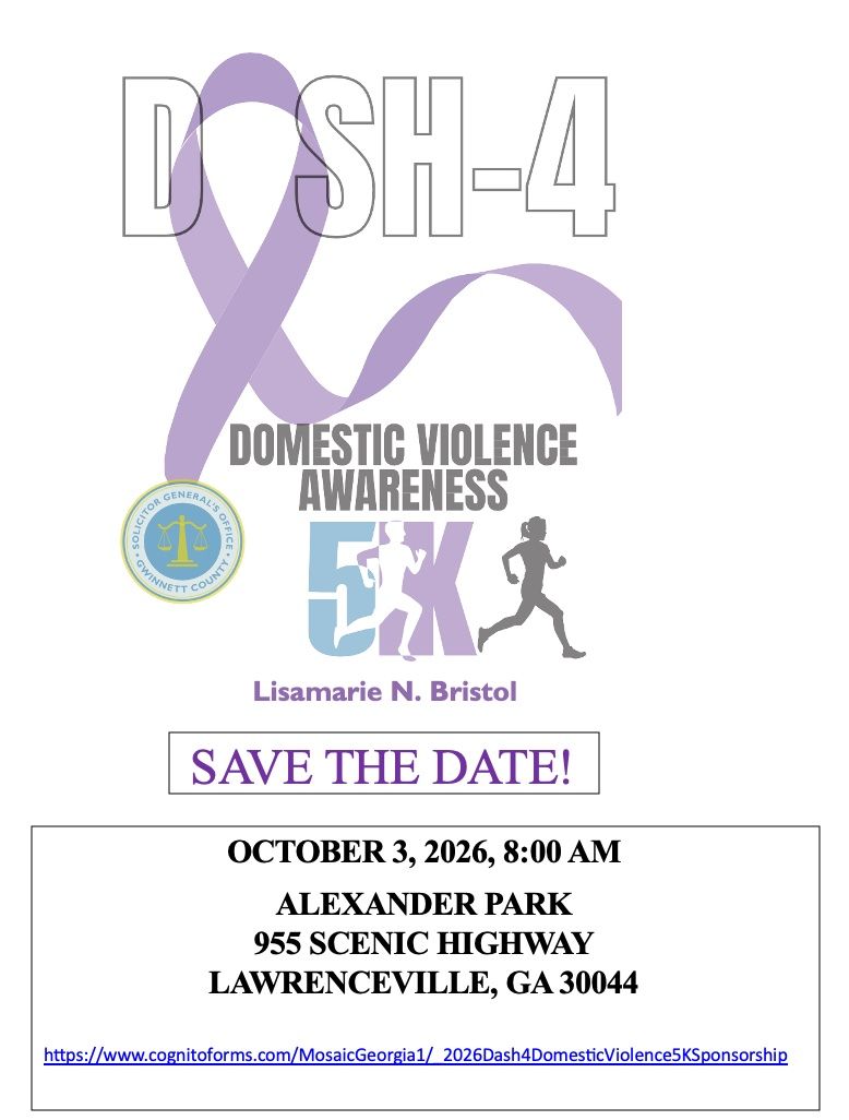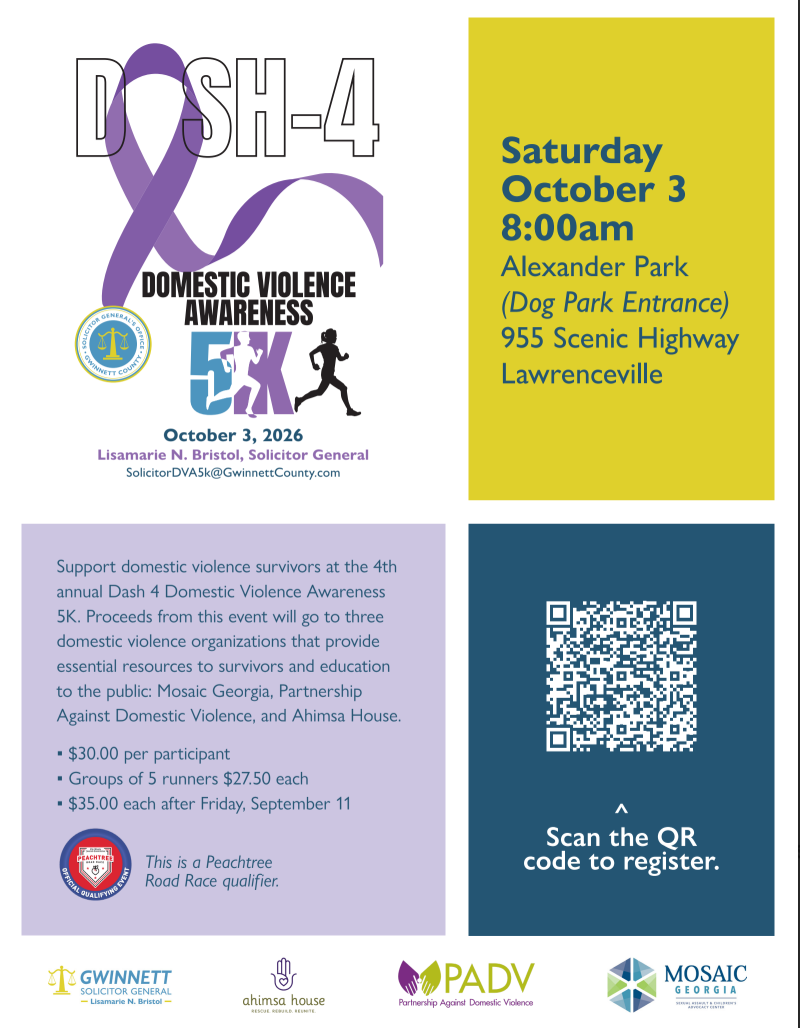 Our 4th annual Dash 4 Domestic Violence Awareness 5K will be an opportunity for the community to come together to raise awareness in the fight against domestic violence in our community. We invite you to support this cause by walking, jogging, running, or becoming a sponsor today. You can help make a difference! Funds from the Dash 4 Domestic Violence Awareness 5K will help support program services for Mosaic Georgia, Partnership Against Domestic Violence (PADV), and Ahimsa House. Mosaic Georgia is a non-profit organization that provides free, confidential support and services to victims and survivors of rape, sexual assault, and child sexual molestation and abuse. PADV works to educate the public on the dynamics of domestic violence, promote healthy dating relationships among adolescents, teens and young adults and offer safety and shelter for abused adults and children. Ahimsa House exists to address the link between animal cruelty and domestic violence. Ahimsa House is the only organization dedicated to helping victims of violence get their pets to safety.