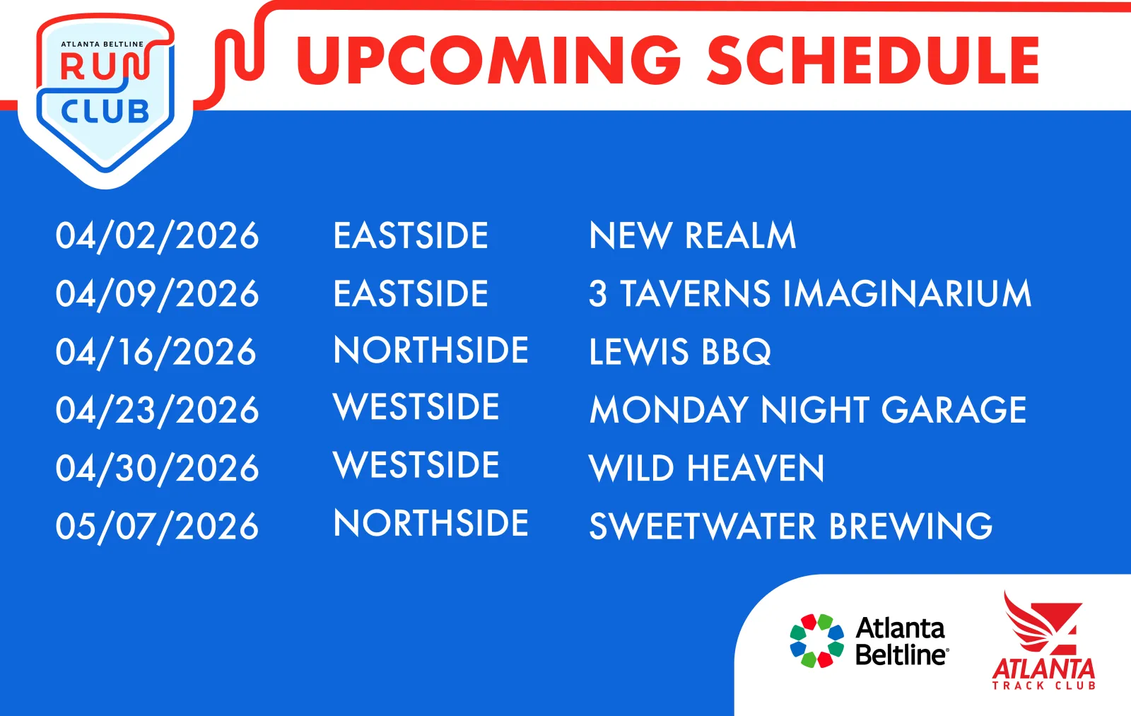 Club group runs rotate weekly between the Southside, Eastside and Westside Atlanta Beltline trails. Runners and walkers will gather in the following locations: