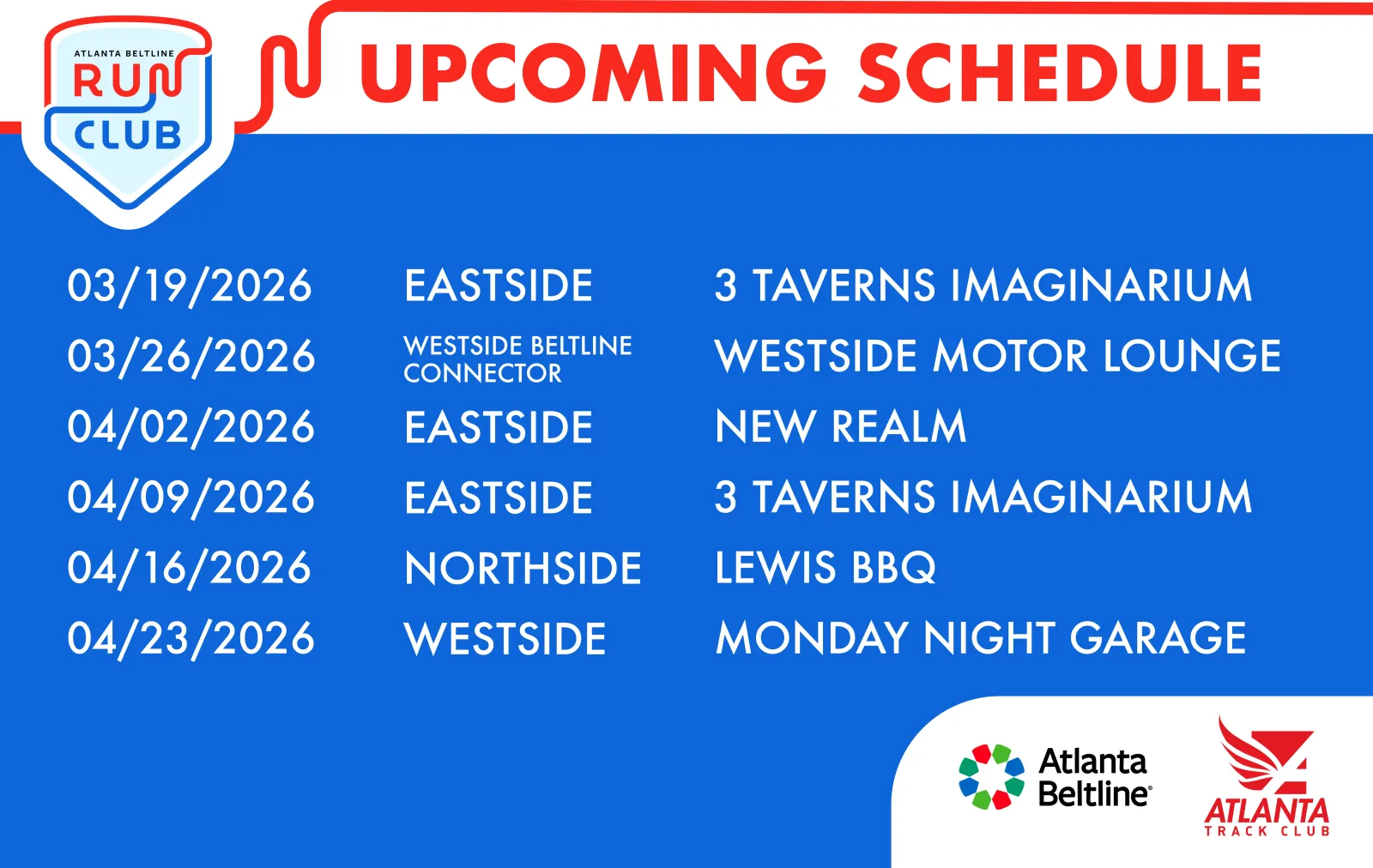 Club group runs rotate weekly between the Southside, Eastside and Westside Atlanta Beltline trails. Runners and walkers will gather in the following locations: