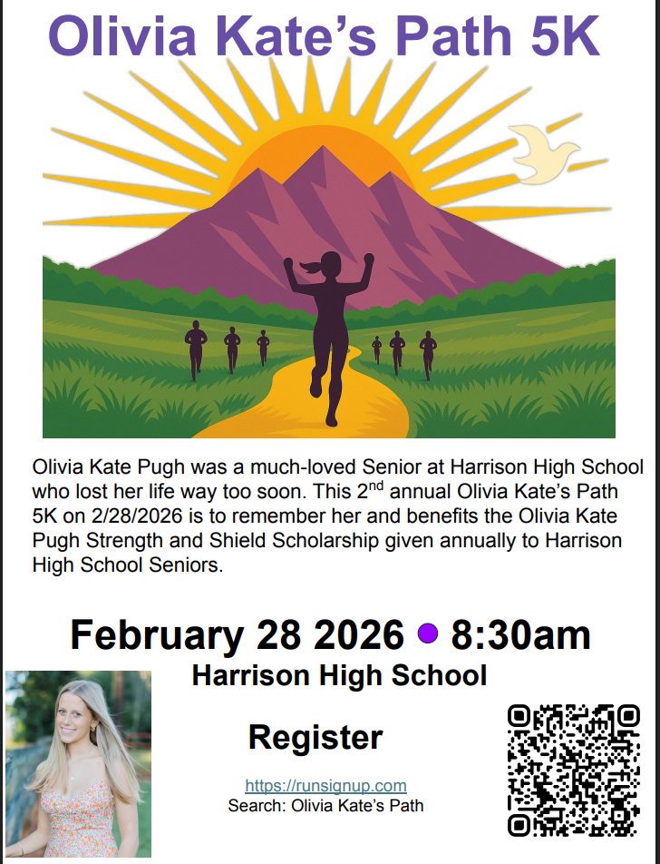 Olivia Kate's Path 5K is being held at Harrison High School on Saturday 2/28/26 to remember and honor 17 year old, Olivia Pugh, who lost her life tragically to a drunk driver. The 5K benefits the Olivia Pugh Strength and Shield Scholarship awarded to Harrison High School seniors annually to use towards future educational plans (college, vocational school, etc). New course and timing company this year! Hope to see you there!