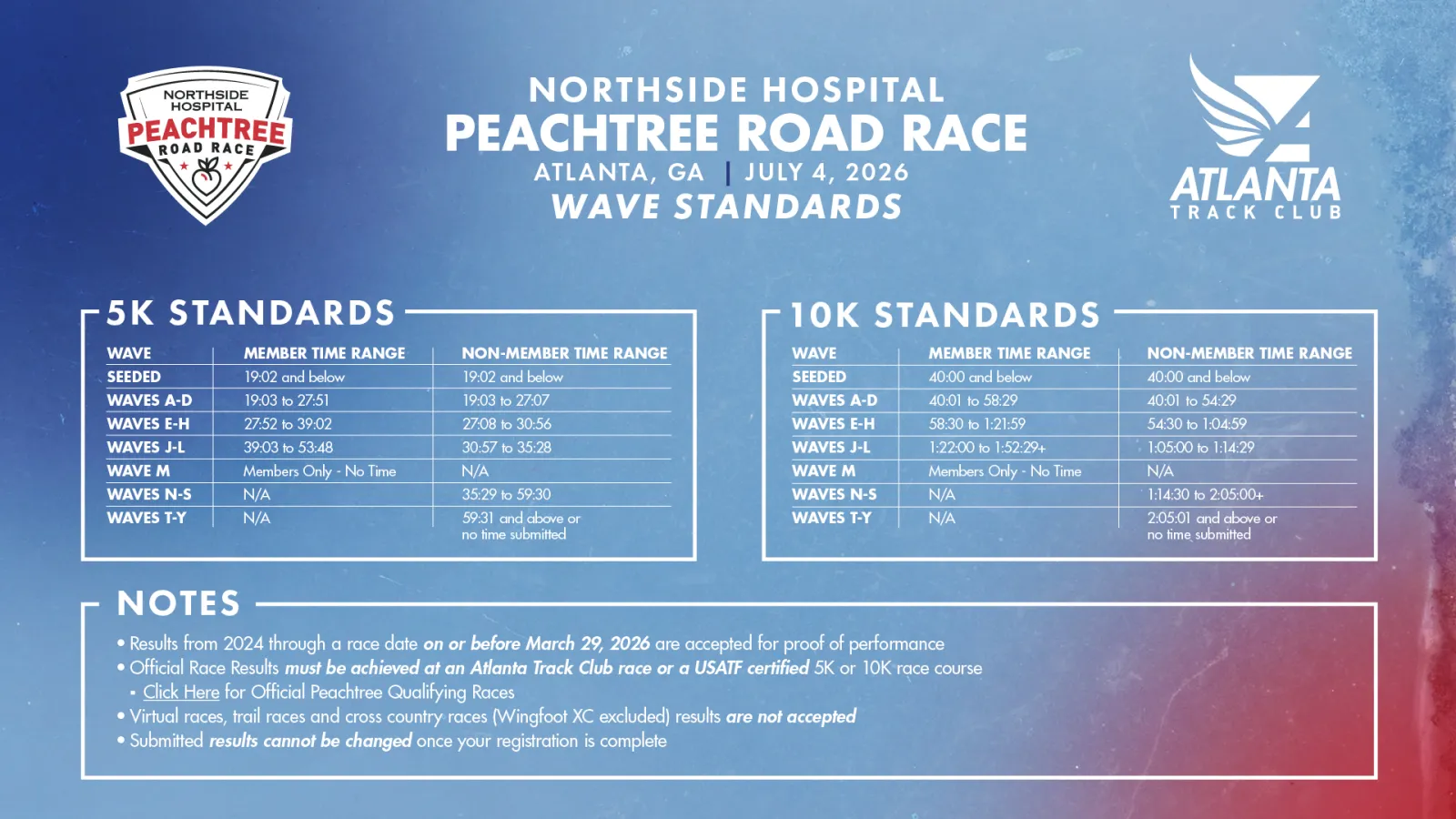 The 2026 Northside Hospital Peachtree Road Race will place runners in start waves based on times submitted in registration. These start waves will be assigned based on the standards above. Members are guaranteed wave M or better. New in 2026, a time range will be used among the start waves in order to best fill the waves. Waves will be filled evenly within the time standards, runners who are within the time range are guaranteed at least the minimum wave for that time range.