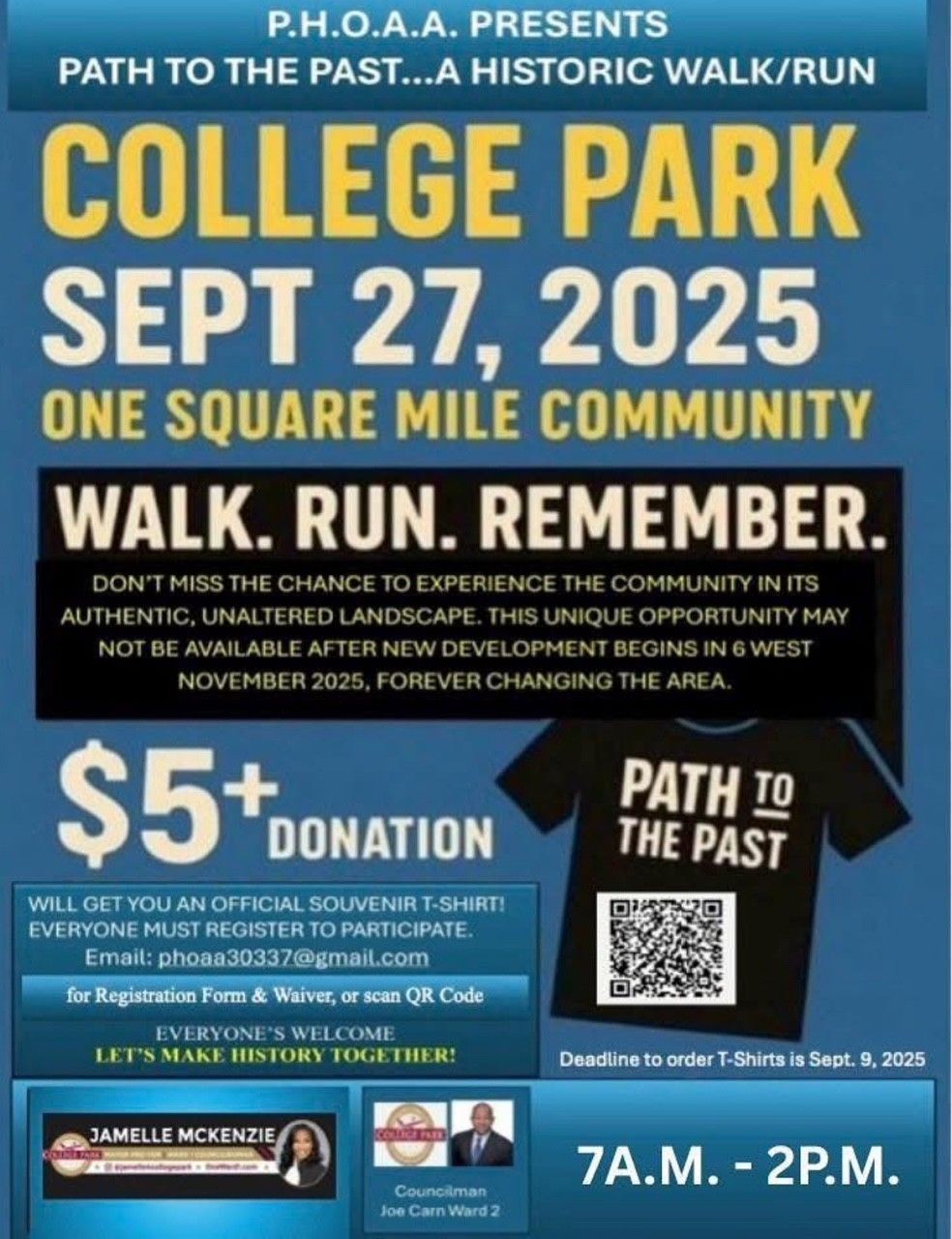 | In the mid-1890's the African American community in College Park, GA flourished within a vibrant one square mile enclave west of Main Street. This neighborhood buzzed with life and energy, characterized by its bustling streets lined with thriving businesses, homes, schools, and churches evident of the community's spiritual backbone, and a strong sense of camaraderie among its residents. The community was a testament to resilience and creativity, where families built a self-sustaining economy amid the harsh realities of segregation. However, the tide turned dramatically between the late 1970s and the late 1990s, as land was acquired by the Atlanta Hartsfield International Airport. The event marked the heartbreaking uprooting of a close-knit community, as families were displaced, homes, schools, churches, and businesses razed to make room for airport expansion that never occurred. Today the echoes of this once vibrant community linger in the air, evident in the few remaining structures that stand as silent witnesses to its history. Among the last remaining structures in our community are Price Barbershop and its neighboring house, both approaching their 100th anniversary. PHOAA is pursuing the designation of these iconic landmarks as historic sites. By restoring them, we can create a dynamic museum that not only draws tourists but also serves as an invaluable resource for educating future generations about the rich history of the vibrant African American community that once flourished in College Park, GA. Preserving these buildings is not just about honoring the past; it's about inspiring a deeper understanding of our heritage and cultural legacy. Sadly, the cherished landscape of our community will reach its demise once the initial 6 West development begins in November 2025. Preserving the history of the "One Square Mile" community is not just important-it's imperative. We have a unique opportunity to document our community's stories and celebrate its rich heritage through the interactive Path to the Past Historic Walk/Run Event scheduled for September 27, 2025 7AM-2PM. This event will occur in Wards 1&2, allowing participants to walk/run the streets that hold our collective memories while in its original landscape, share those stories with one another, and foster a deeper connection among all participants. PHOAA, Inc. is a nonprofit organization recognized as a 501(c)(3). It is made up of legacy members who resided in the One Square Mile community, and is dedicated to preserving the oral, written, and photographic heritage of this original African American community in College Park, GA. We invite you to join us for what promises to be an exceptional cultural and community event. Please share this event with your members. The event is free, but a donation is appreciated. First, second, and third place winners will receive a customized metal. All other participants will receive a generic metal. Unfortunately, the date to request a t-shirt have passed. However, there will be extra available on a first come first serve basis. Let's Make History Together! If you have any questions, please contact us at: phoaa30337@gmail.com OR Submit a question from our website: phoaa.org Donations Supports PHOAA's Preservation Efforts. Zelle: phoaa30337@gmail.com CashApp |