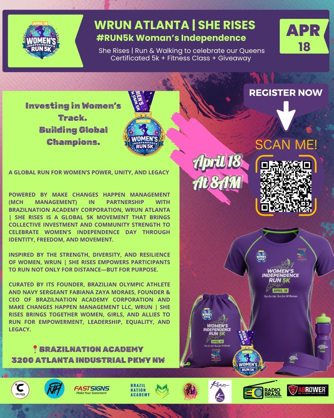 A Global Run for Women's Power, Unity, and Legacy. Powered by Make Changes Happen Management (MCH Management) in partnership with BrazilNation Academy Corporation. We invite everyone to celebrate our queens! Run for Her. Run for All Women WRun | She Rises is more than a race. WRUN | She Rises is a global 5K movement that brings collective investment and community strength to celebrate Women's Independence through identity, freedom, and movement. Inspired by the strength, diversity, and resilience of women, WRun | She Rises empowers participants to run not only for distance—but for purpose. Curated by our founder the Brazilian Olympic Athlete and Navy Sergeant Fabiana Zaya Moraes Founder and CEO of BrazilNation Academy Corporation and Make Changes Happen Management LLC, she caries the spirit of International Women's Celebration, WRun | She Rises brings together women, girls, and allies to run not only for distance—but for Empowerment, Leadership, Equality, and Legacy. Each participant runs with a purpose: To honor women who came before. To empower girls who will shape the future. To ignite the fire within every woman. She doesn't rises alone. She rises together. She rises forever. COMMUNITY & IMPACT COMPONENT Each WRunner must support at least ONE cause: Girls in sport Women's education Health & wellness Domestic violence prevention Economic empowerment EVENT STRUCTURE Race Categories: Women Open 5K Girls & Teens walk/Run (1K or 2K no timing) Allies & Families Wave Mother-Daughter Duo Corporate Women Team Challenge Elite / Competitive Wave (optional) Supporters mixed team 5k run (Man/woman, business owners, gym teams, restaurants teams, corporate teams) Official Bib Concept "I Run For: ________" Participants dedicate their run to a woman who inspired them. WRUN Atlanta | She Rises #Run5k International Women's Independence Investing in Women's Track. Empowering the Next Generation. WRUN Atlanta | She Rises Run5k International Women's Independence is more than a celebration—it is a community investment in the future of women in sport and part of Atlanta 5K #RUN Independence Series. 1. Oficial course certified by USATF 2. Approved by Atlanta Track Club 3. Approved by Big Peach Running Co. 4. Approved by The City Of Atlanta FUNDRAISING Our goal for 2026 is to raise $150,000 thousand to develop and expand women's track and field programs in Atlanta, USA, and Rio de Janeiro, Brazil through BrazilNation Academy Corporation a 501(c)(3) founded by our Brazilian Olympic Athlete and Navy Sergeant, Fabiana Zaya Moraes that will also help her to continue training for the Olympic Games at LoS Angeles 2028; to guide, protect and lead the next generation of Olympic athletes and young leaders. Every race entry is a donation and community empowerment that directly finances and supports girls and young women by providing access to: 1. Professional coaching and high-performance training. 2. Scholarships for underserved athletes Sports equipment, uniforms, and facilities. 3. Mental health, leadership, and life-skills programs. 4. International exchange opportunities between the U.S. and Brazil. 5. Safe, structured environments for girls to thrive through sport Celebrate with us on April 18, 2026 Time: 8 AM Location: BrazilNation Academy | FIELDS (One Touch Soccer) 3200 Atlanta Industrial Pkwy NW 30331 United States Of America